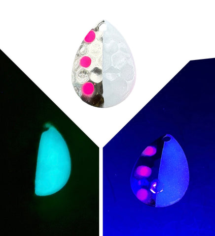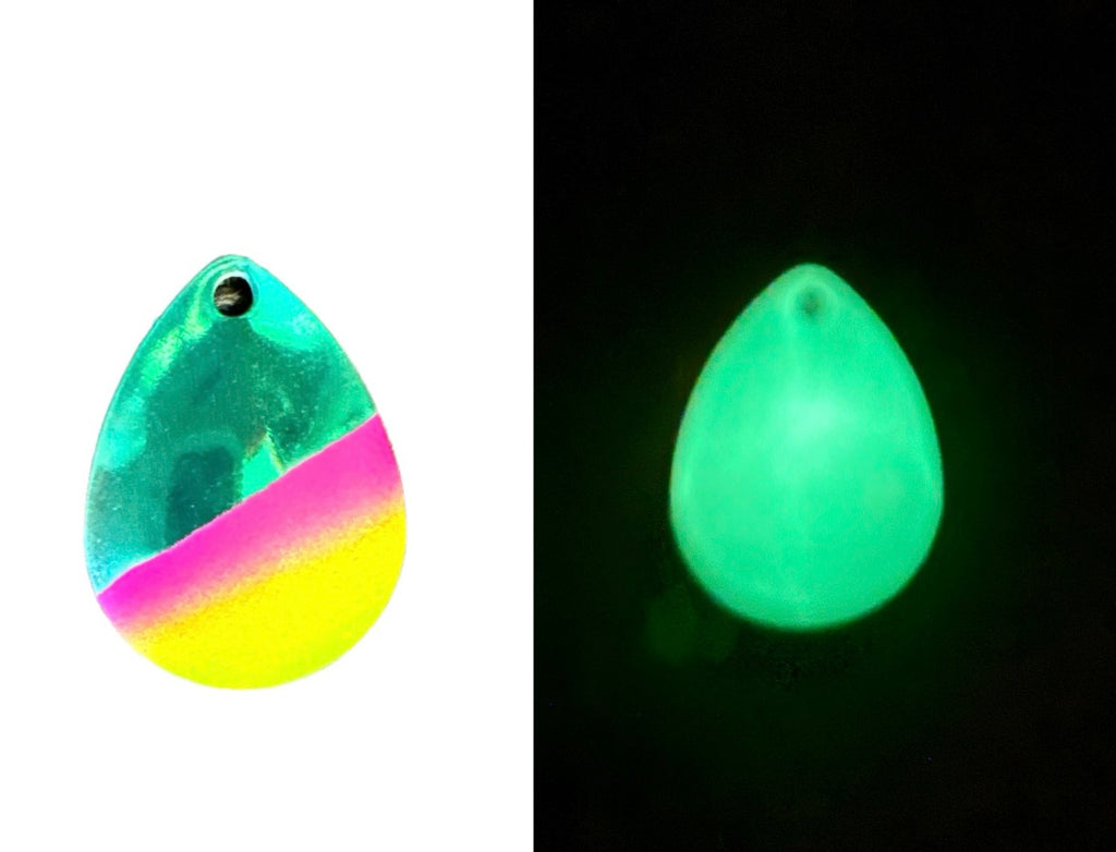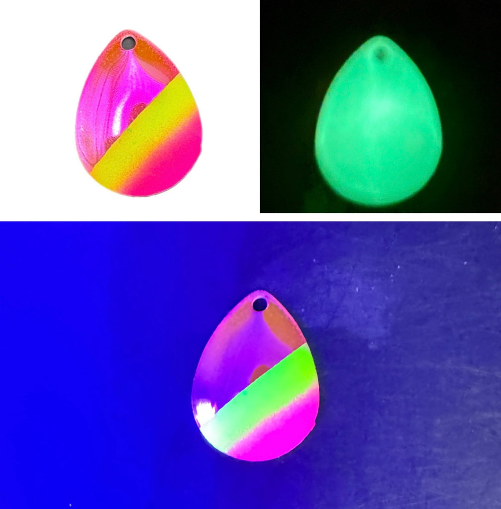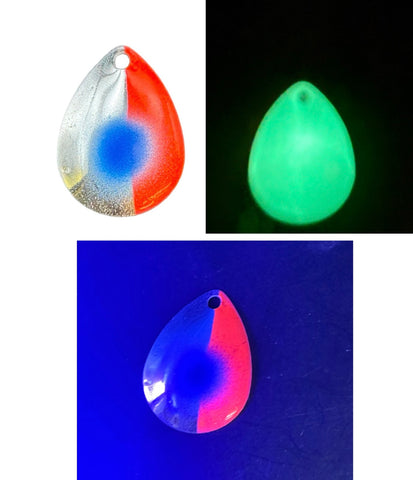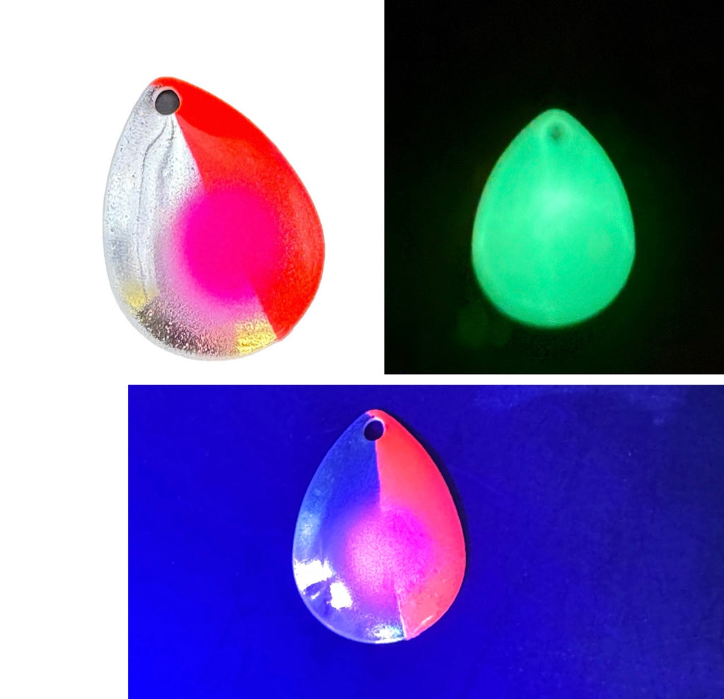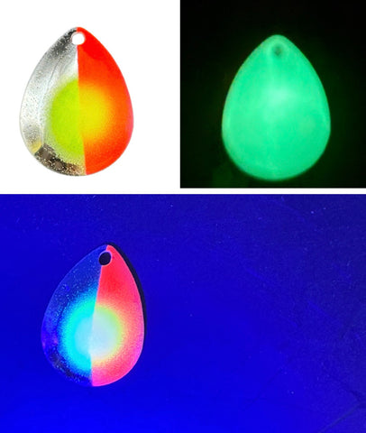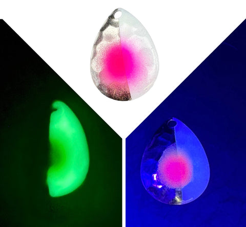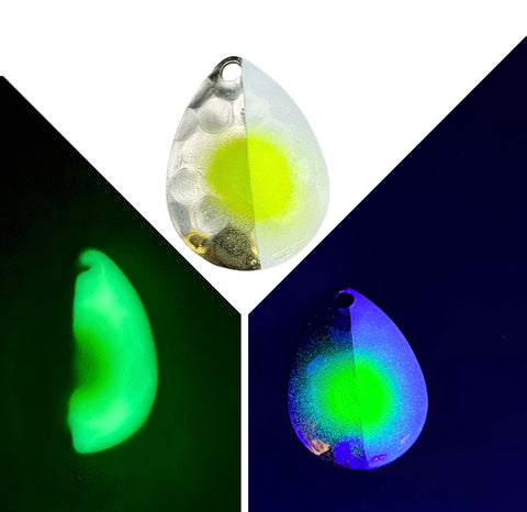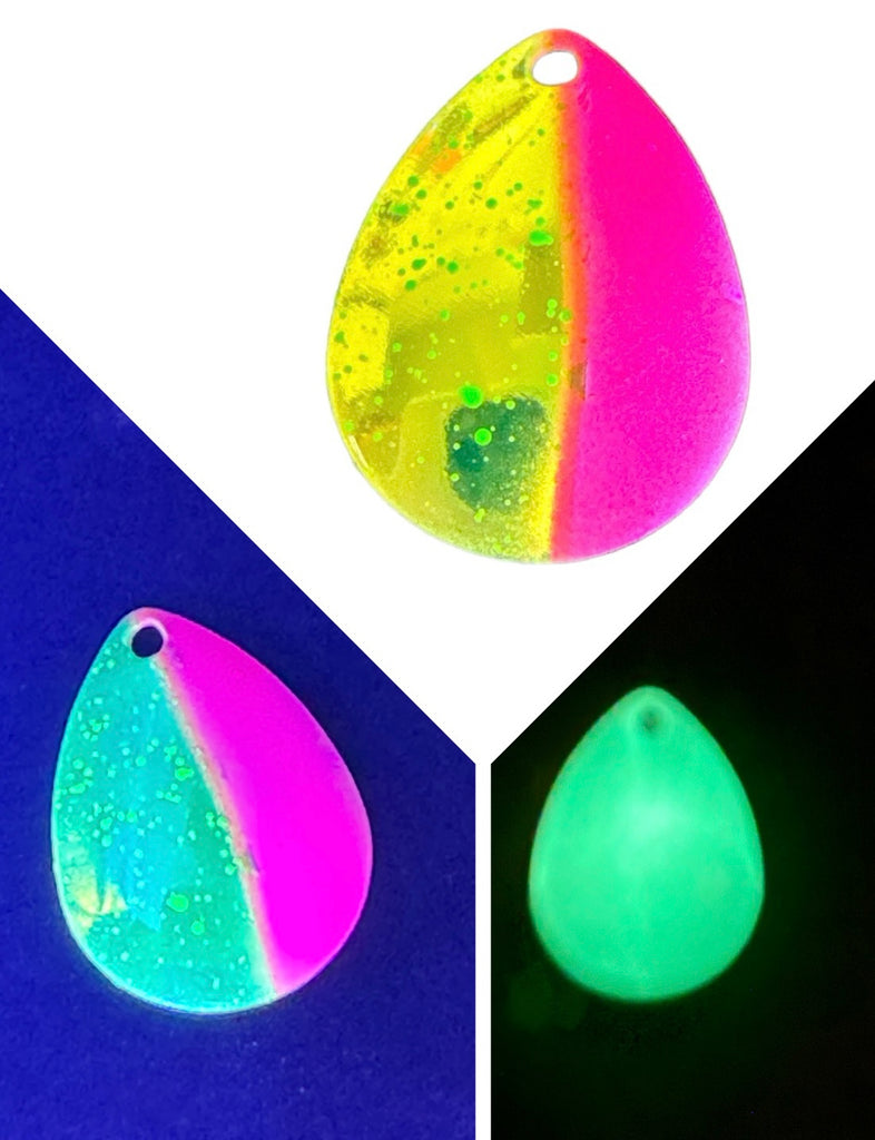 Legacy Fishing Custom Glow blades set you apart from any angler. We offer two Alien Glow colors. Green alien, and Blue alien. We combined the already popular Double vision blades, where the colors change under UV light. Lime to Chart. Pink to Orange . Magenta to orange. Green to chart.