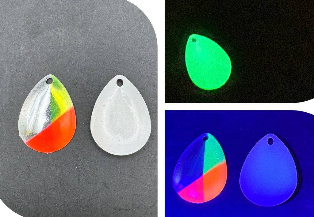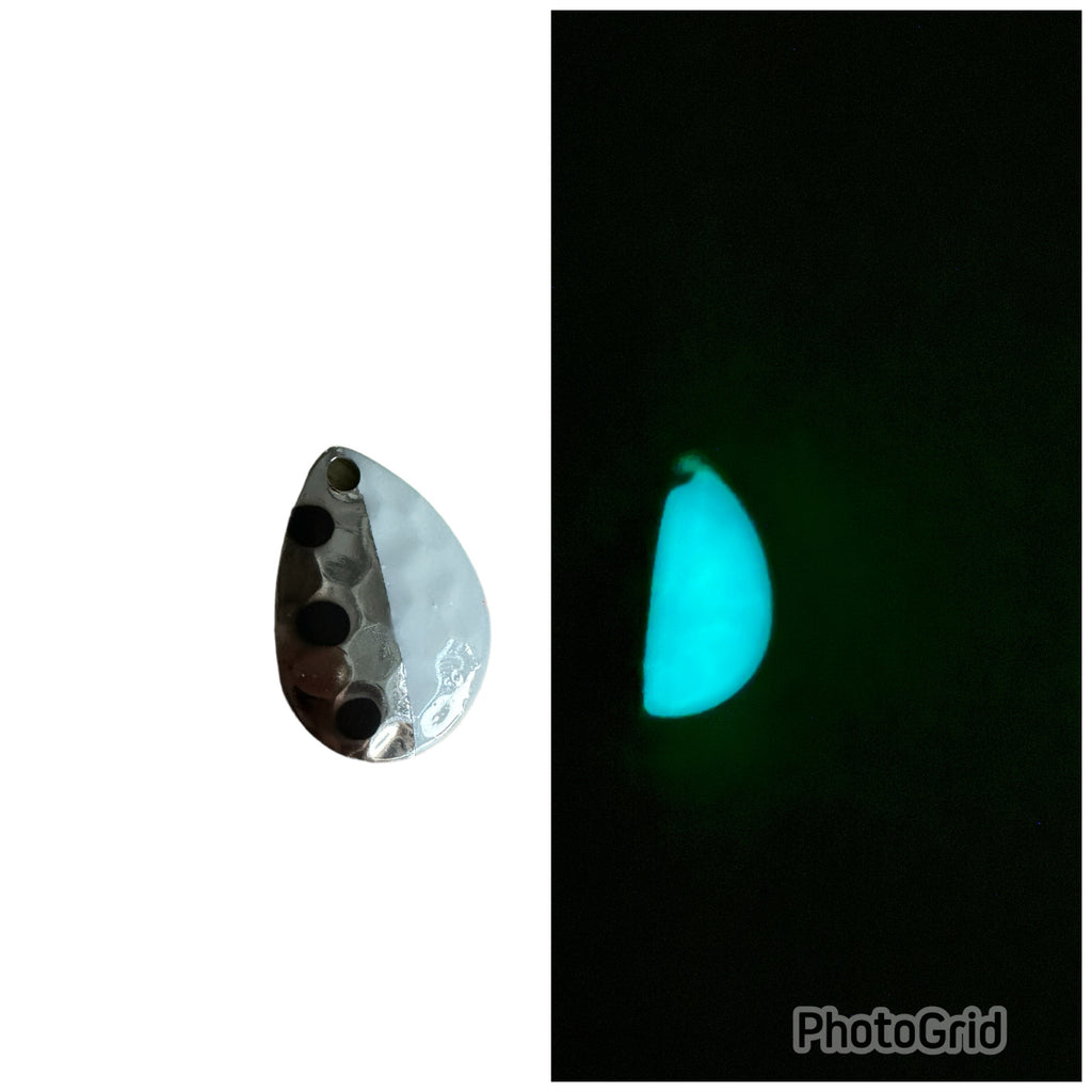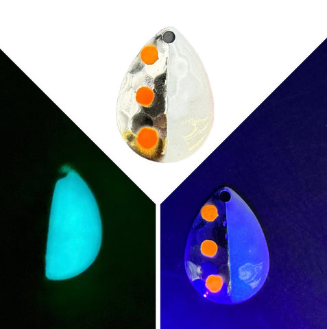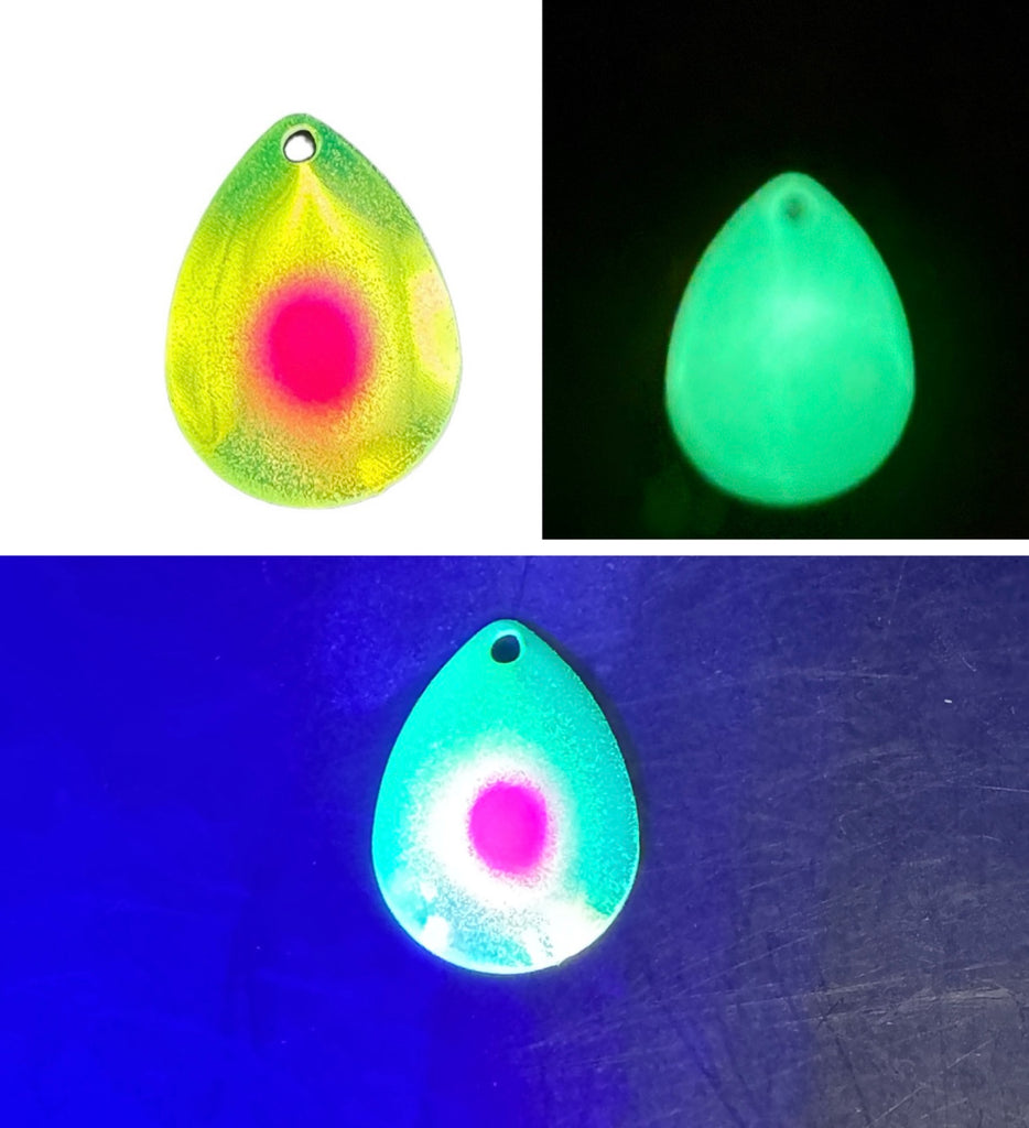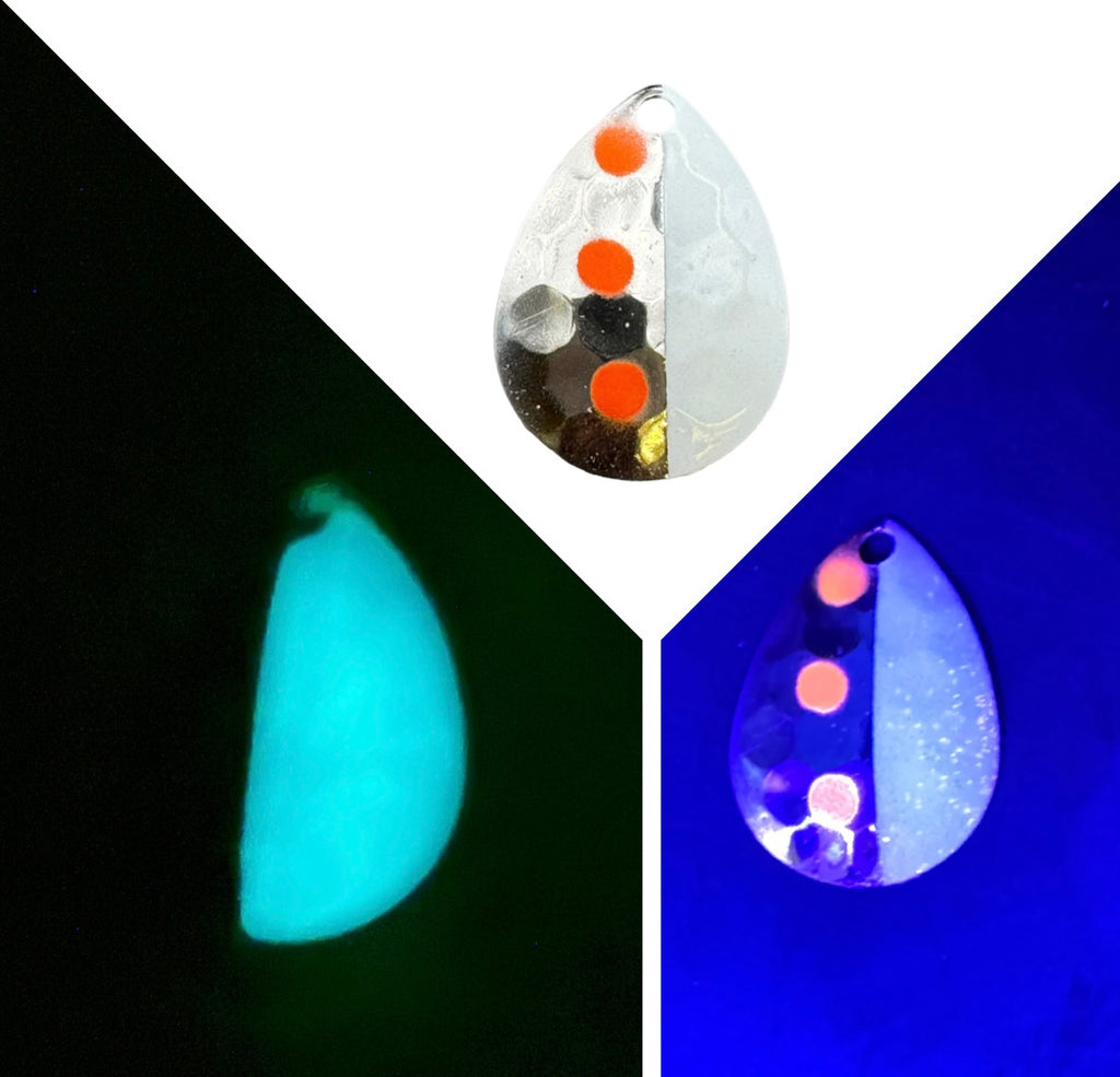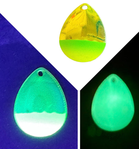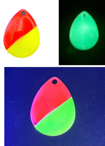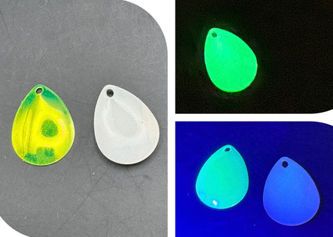 Legacy Fishing Custom Glow blades set you apart from any angler. We offer two Alien Glow colors. Green alien, and Blue alien. We combined the already popular Double vision blades, where the colors change under UV light. Lime to Chart. Pink to Orange . Magenta to orange. Green to chart.