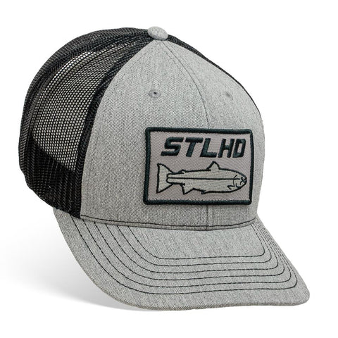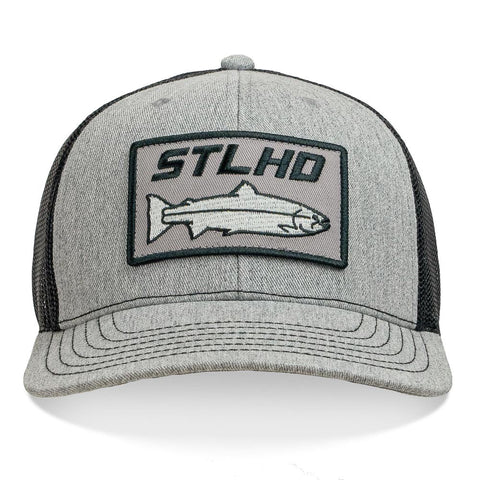 Introducing the redesigned STLHD Chrome Edition Trucker hat, we've taken one of our most popular hats and made it better. Crafted on our exclusive custom hat blank, this head-turning trucker boasts a contemporary heather grey, complemented by black and silver accents. Inspired by the mesmerizing look of Steelhead fresh from the ocean. Embrace the outdoors with this revamped trucker hat.
