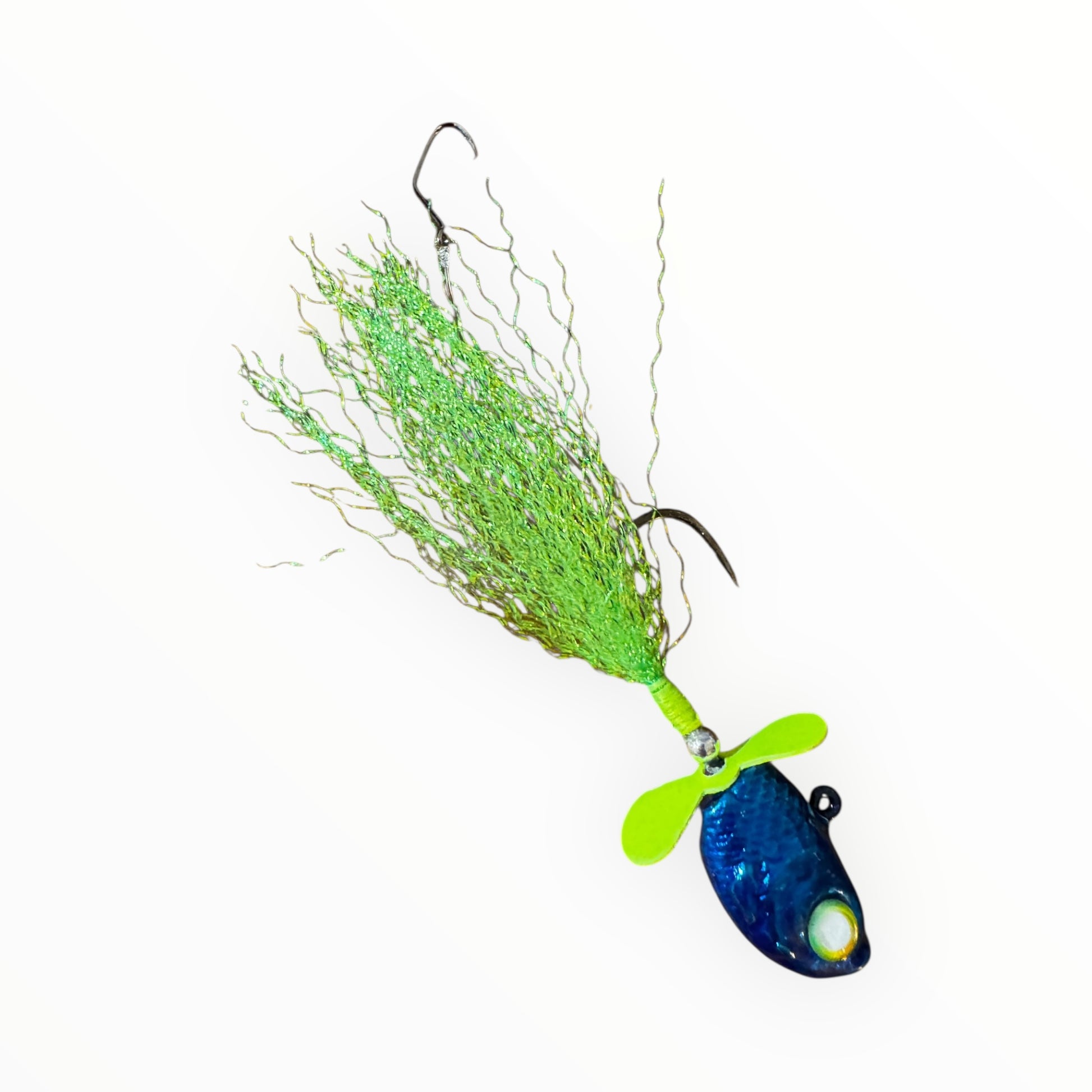 Custom made walleye jigs double hook and propeller . jig and trailer hook made with victory hooks.